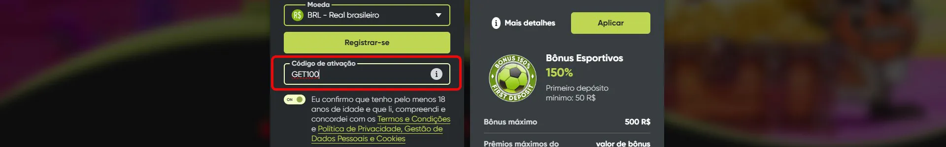 Clique no texto «Tem um código de ativação?» e insira o código promocional GET100. Se você pular esta etapa, não poderá receber o bônus de cadastro do Fresh Casino. Passo 4